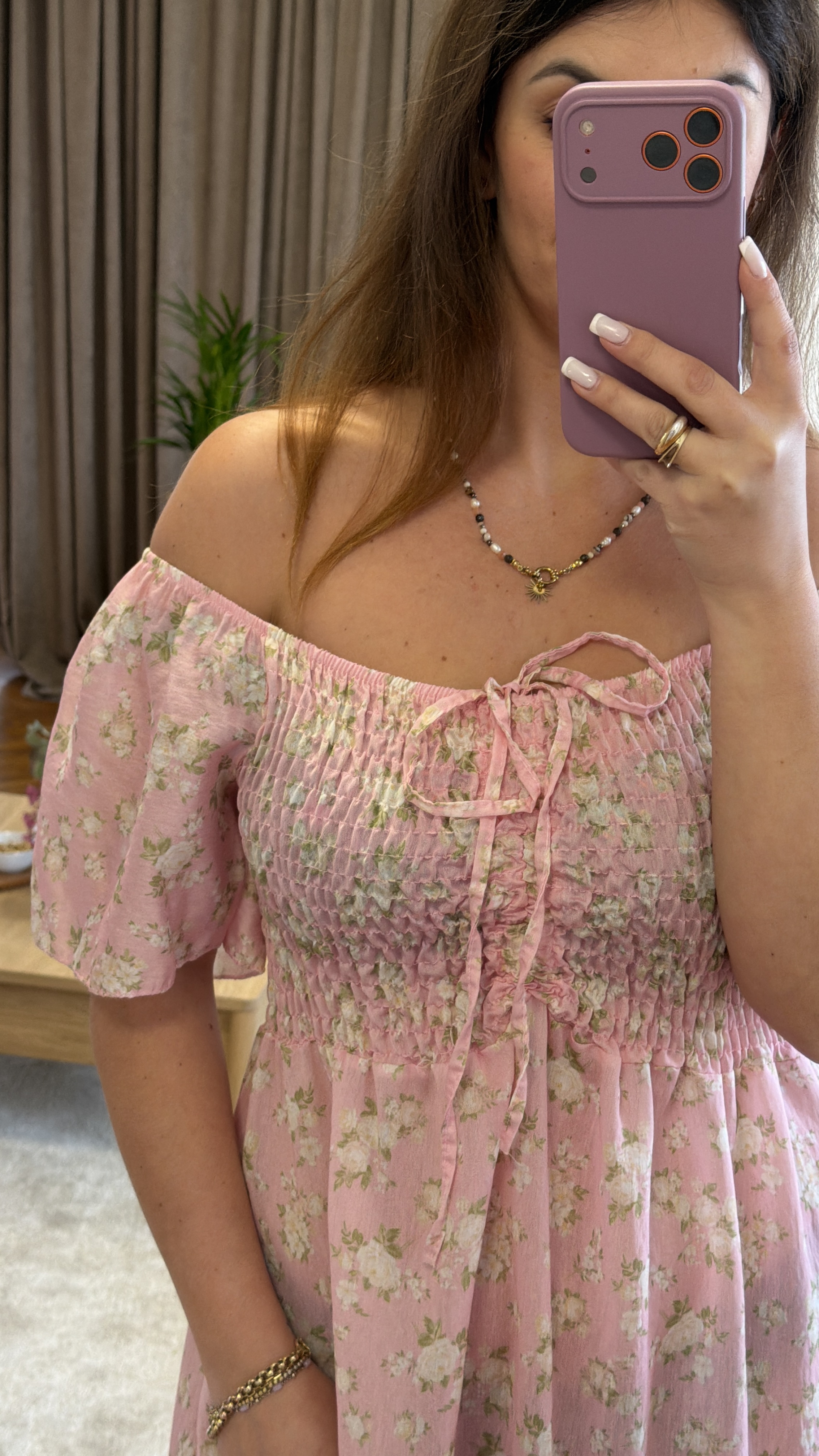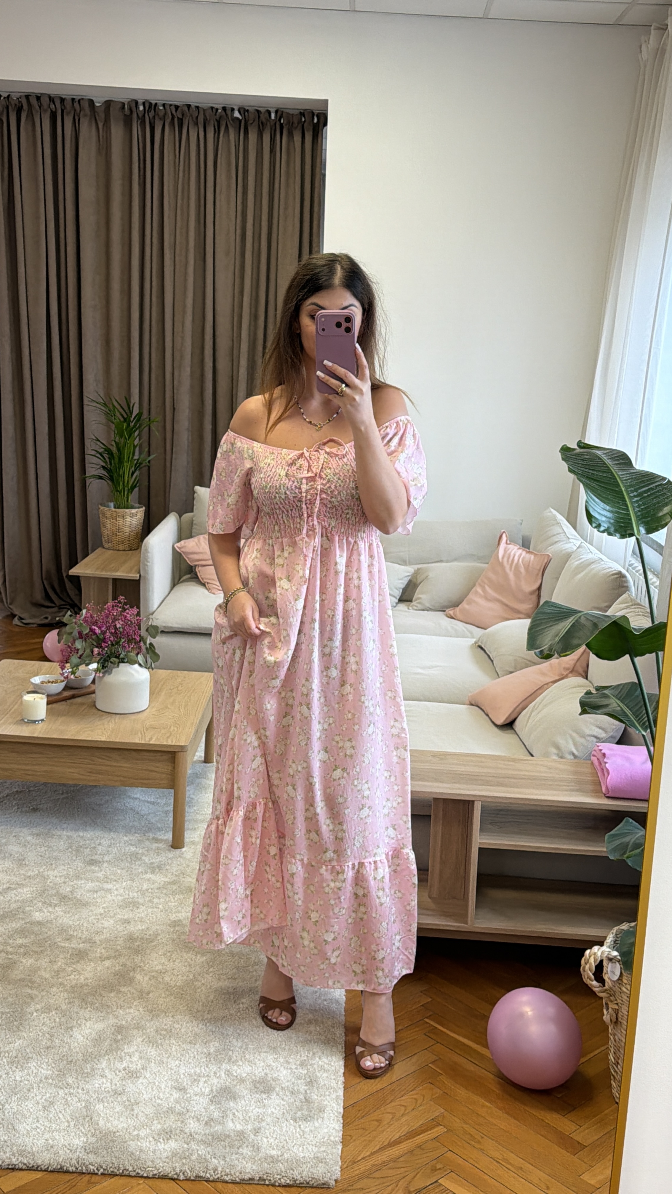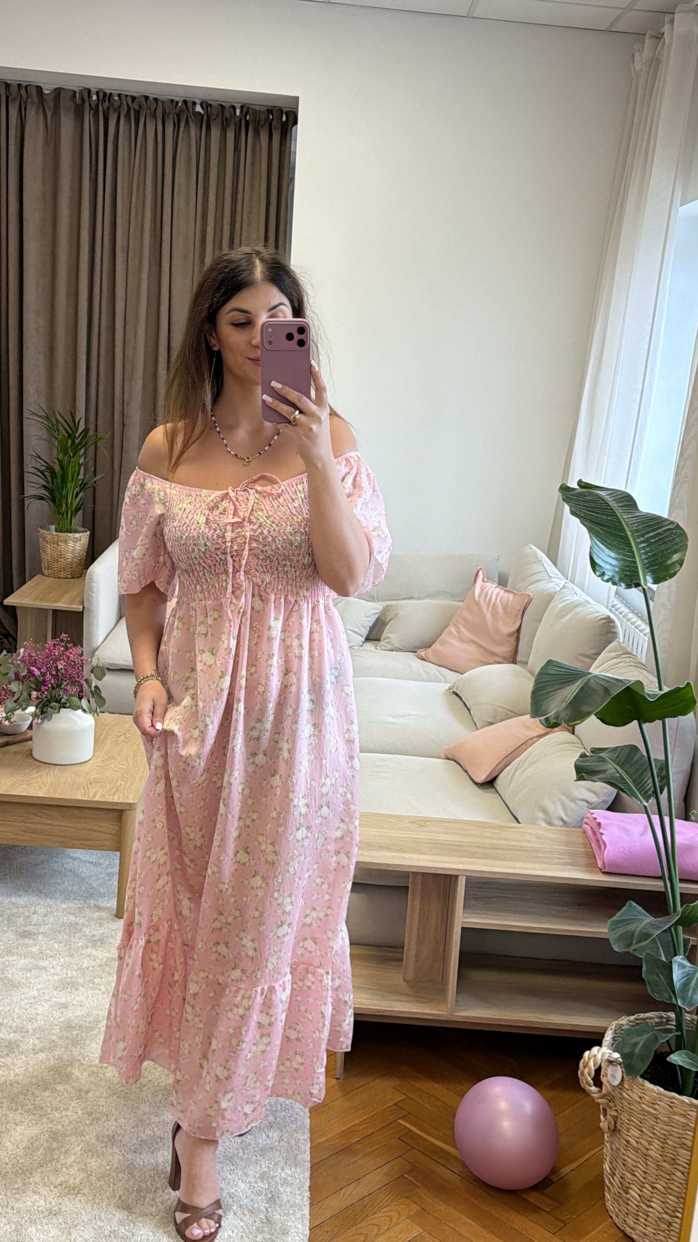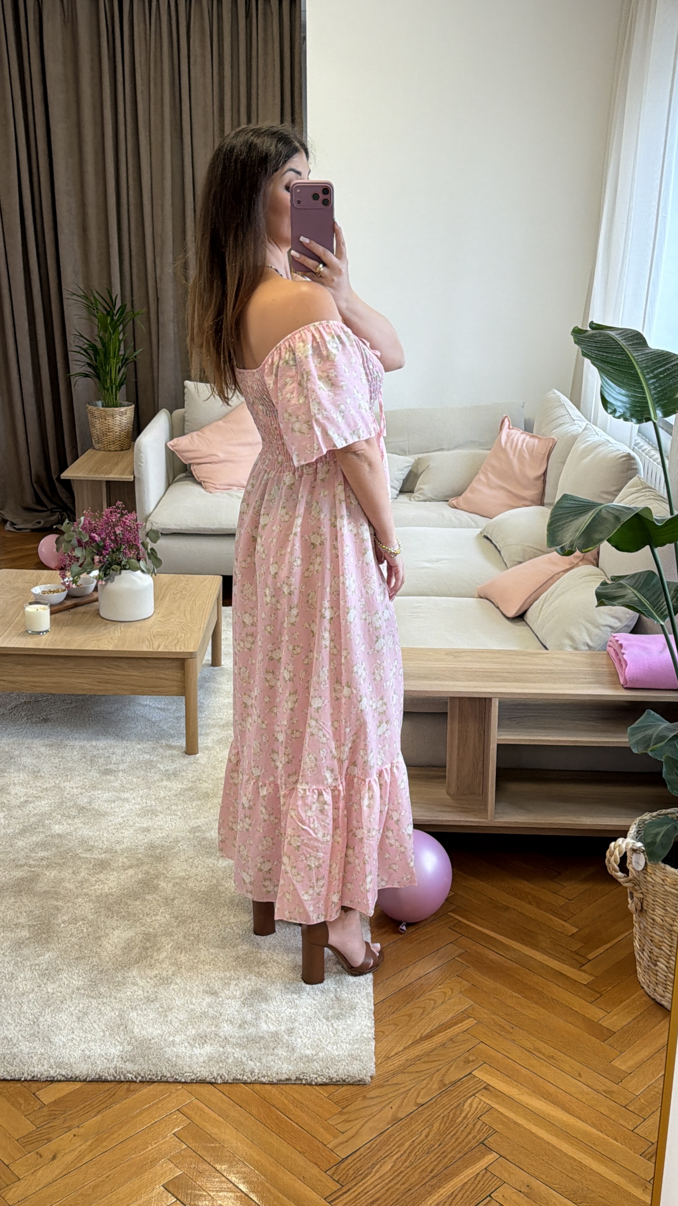 Fiorella – pudrowa sukienka midi z elastyczną górą i rozcięciem