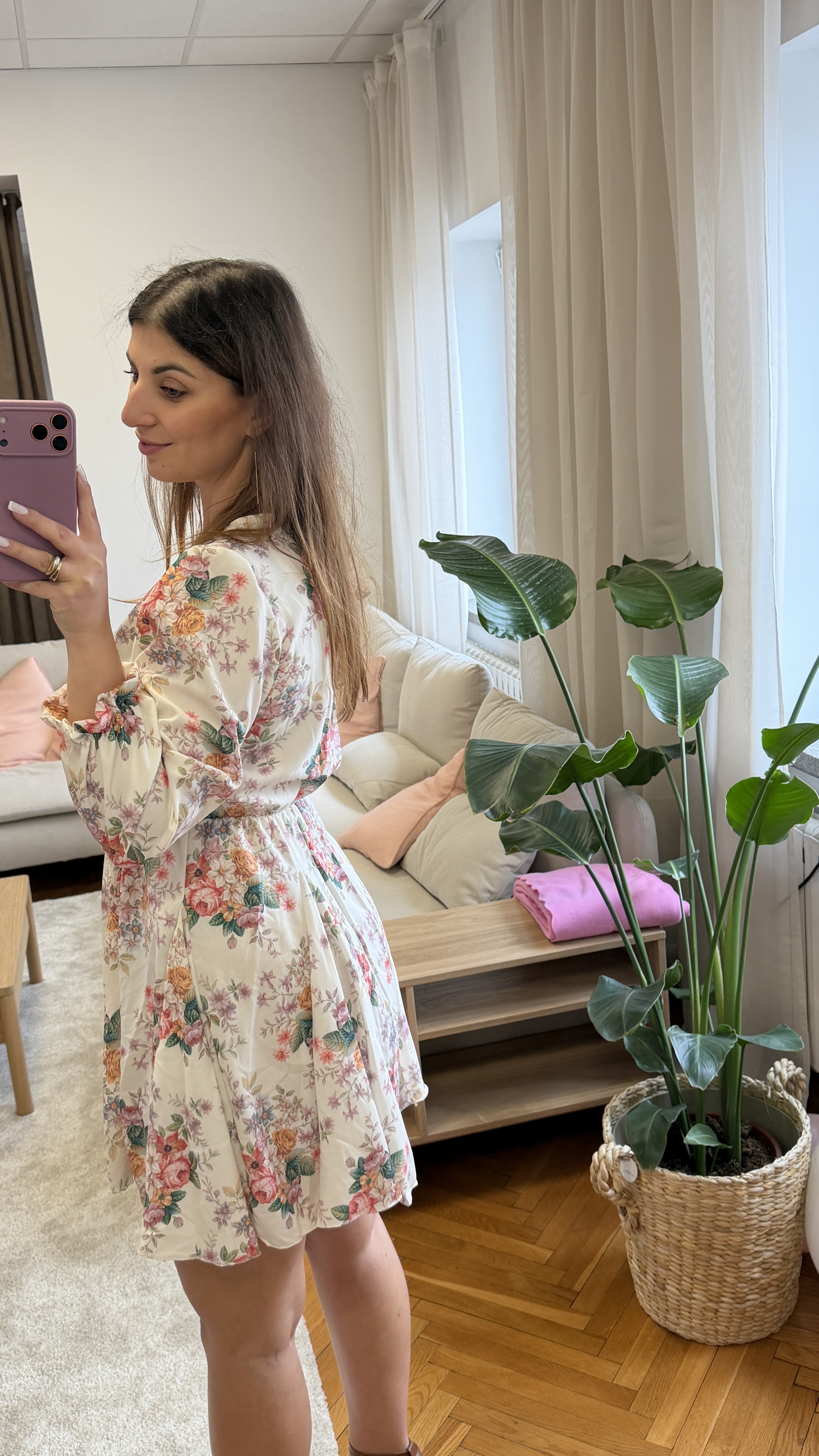 Delikatny, zwiewny materiał sprawia, że sukienka świetnie pracuje w ruchu i jest idealna na cieplejsze dni. Długość mini eksponuje nogi, a długi rękaw dodaje całości równowagi i sprawia, że model sprawdzi się nie tylko latem, ale również w przejściowych stylizacjach.