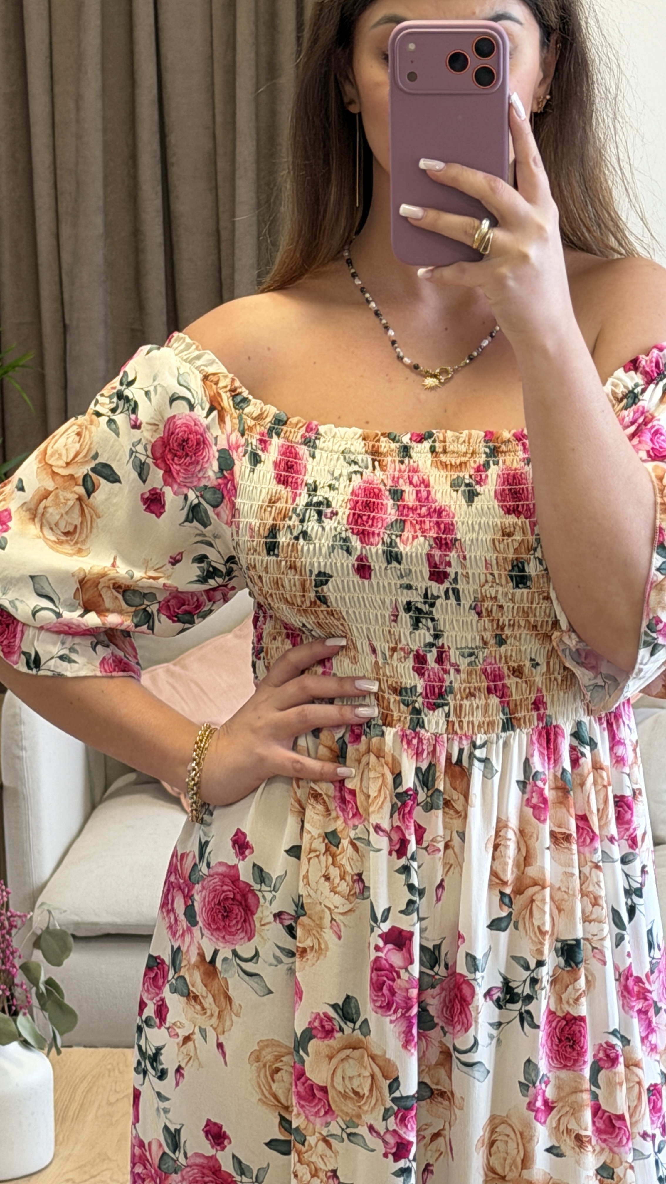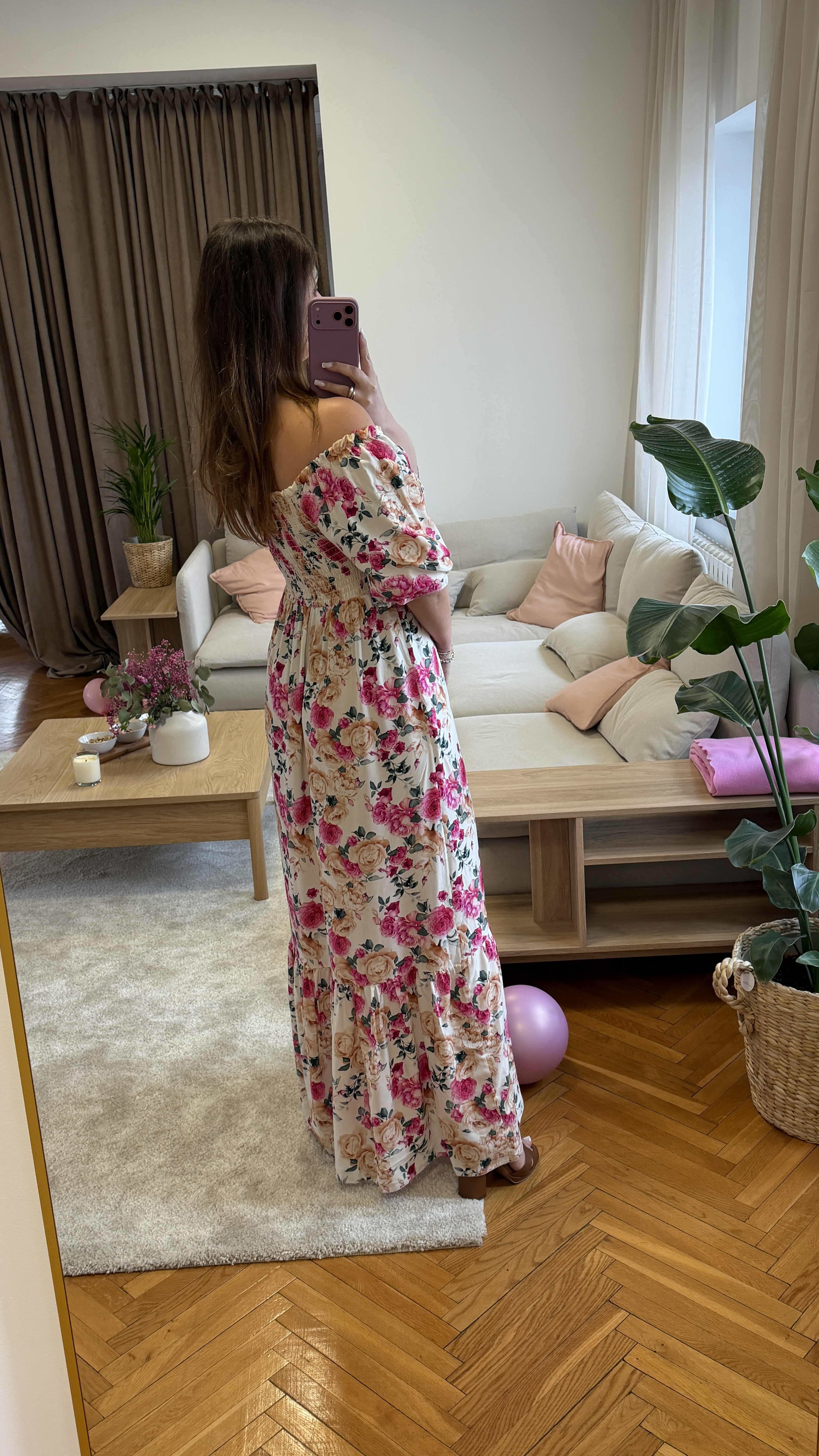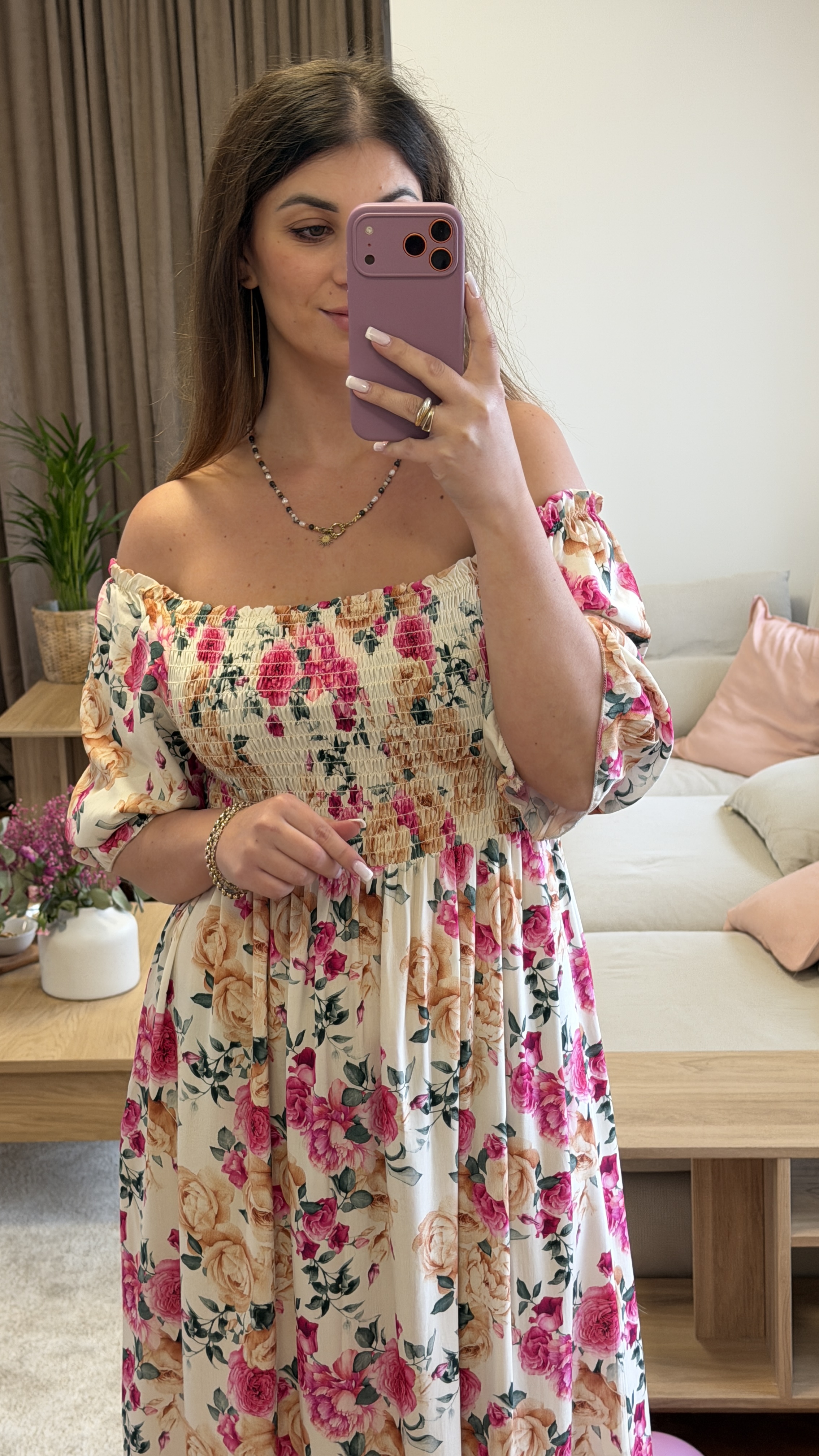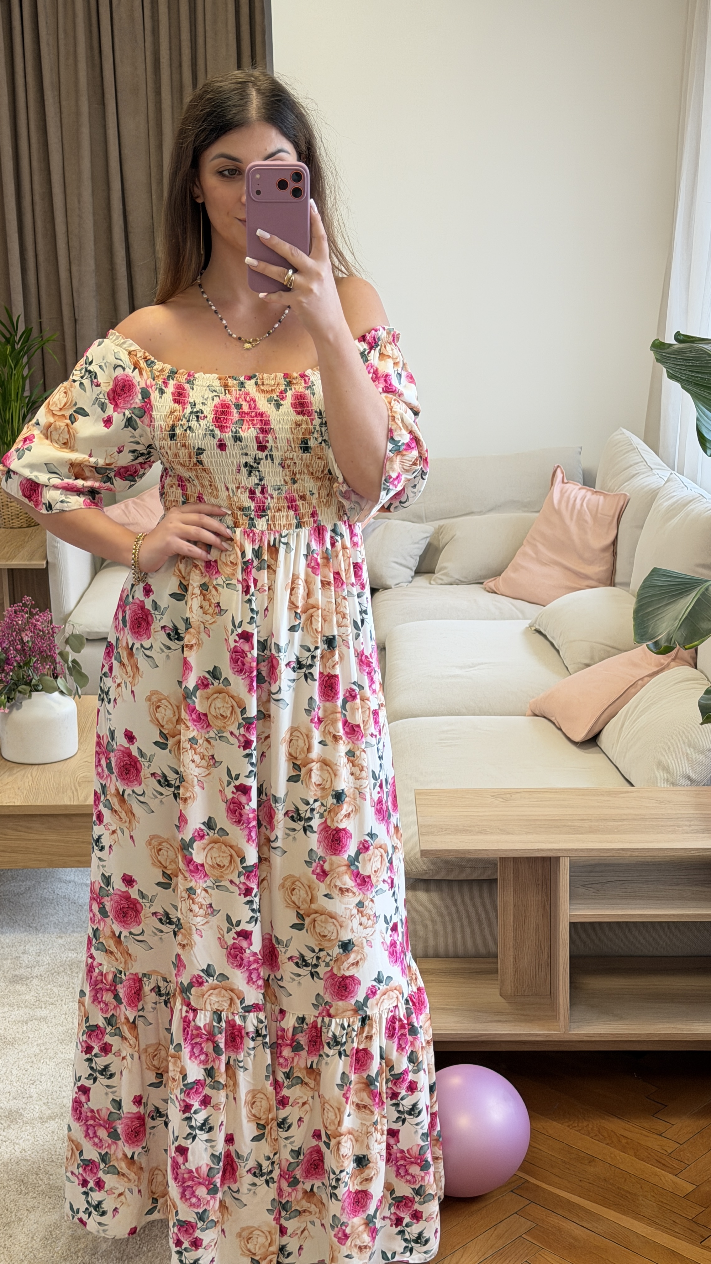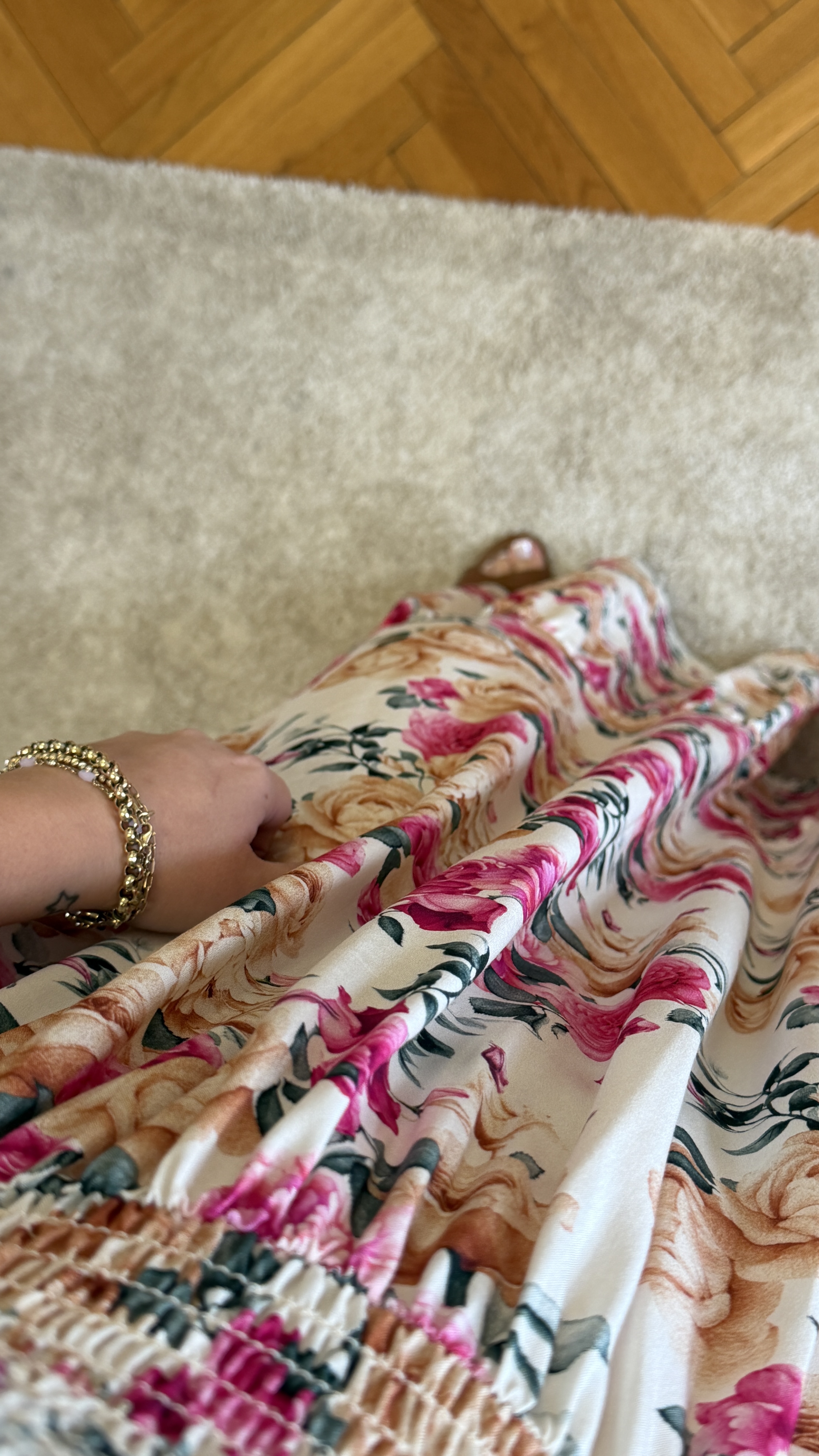 Rosalia- sukienka maxi z elastyczną górą i efektem hiszpanki w różowe kwiaty