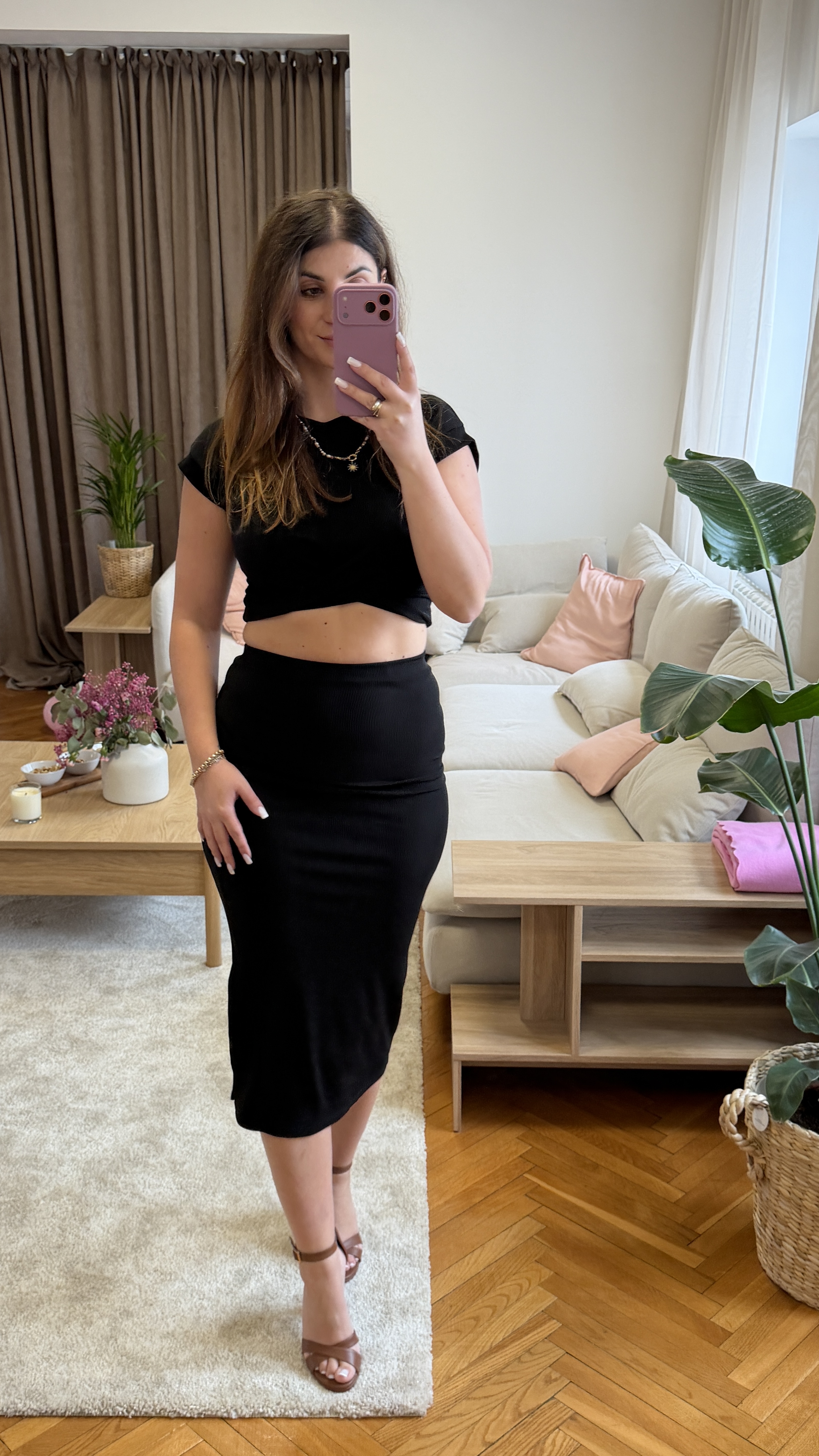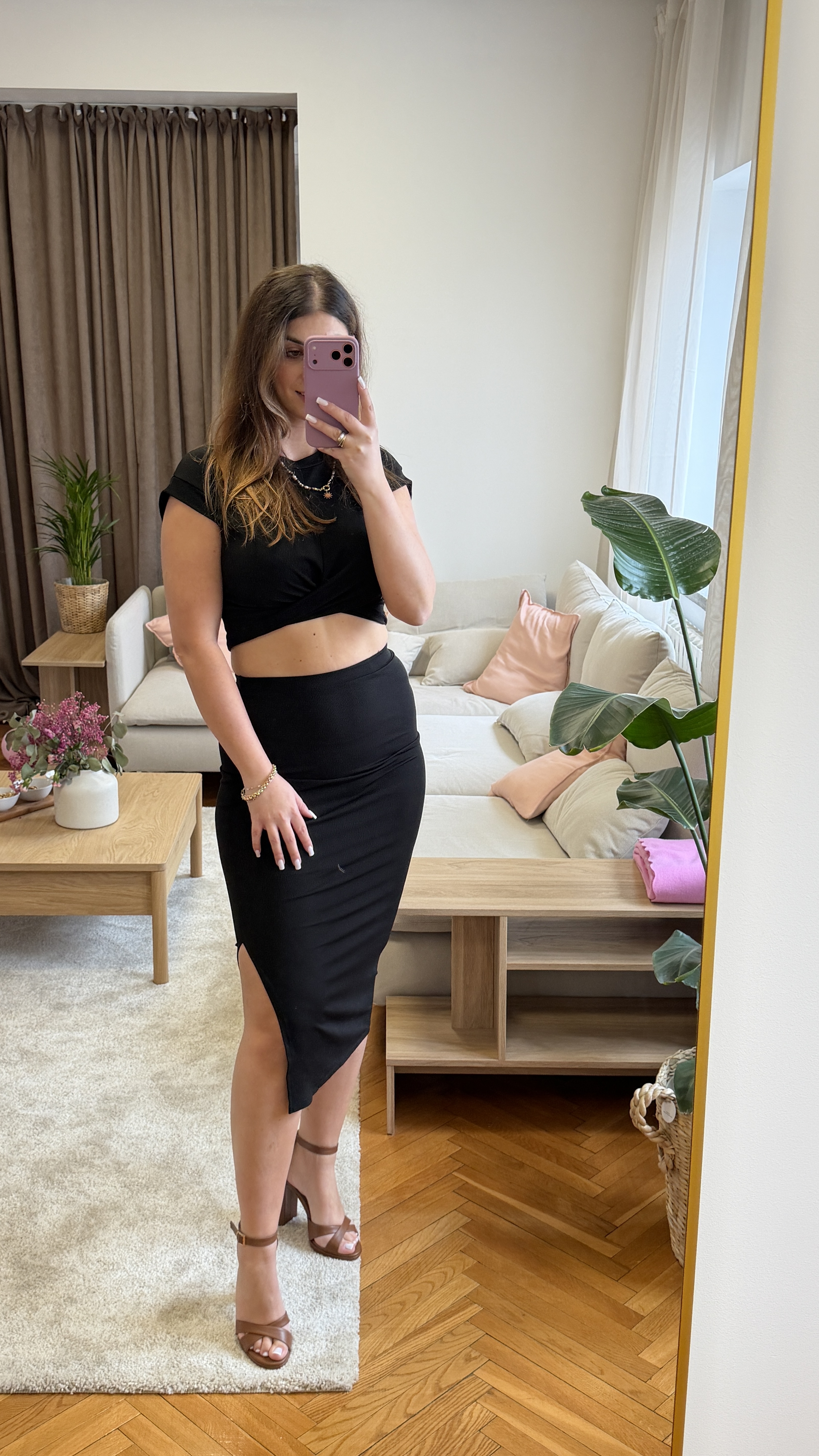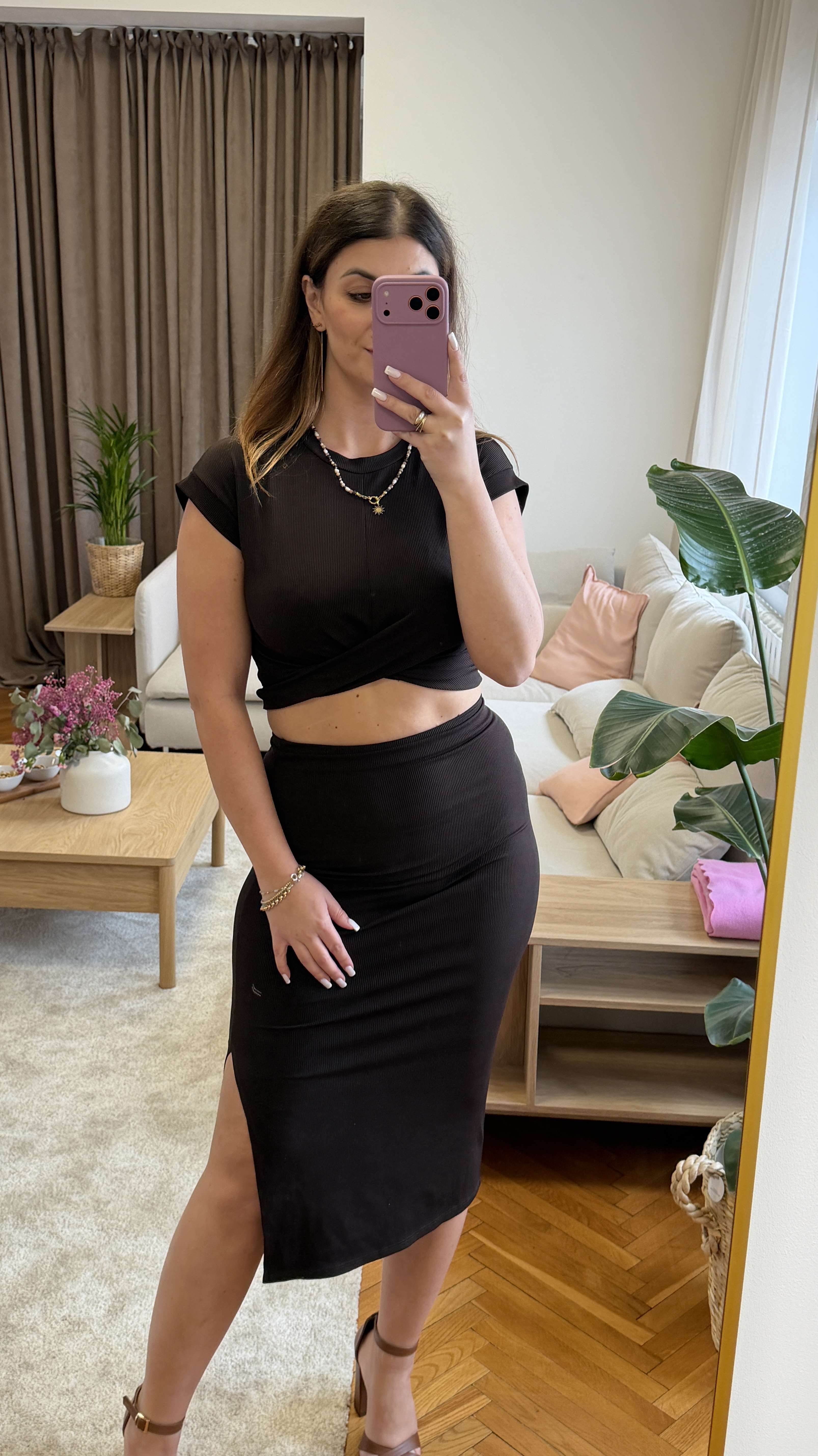 Selena to komplet, który podkreśla sylwetkę w najbardziej kobiecy sposób. Dopasowany top pięknie układa się na ciele, a spódnica midi z rozcięciem optycznie wydłuża nogi i dodaje całości subtelnej zmysłowości.